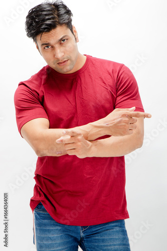 © Anupam, Obraz premium Young man wearing a red t-shirt, denim jeans, and sneakers posing casually in a studio against a plain white background. Ideal for themes of fashion, confidence, and modern lifestyle.