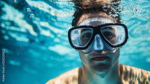 Naklejka premium Young man wearing diving mask swimming underwater in the sea