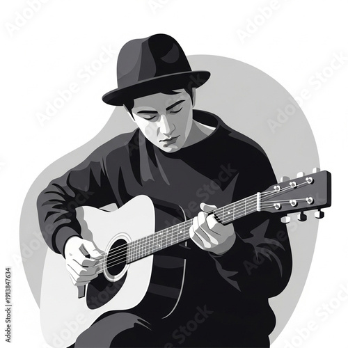 Obraz premium Young Man Wearing Hat Playing Acoustic Guitar in Black and White.