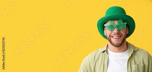 © Pixel-Shot, Fototapeta premium Young man wearing leprechaun's hat and party glasses on yellow background with space for text. St. Patrick's Day celebration