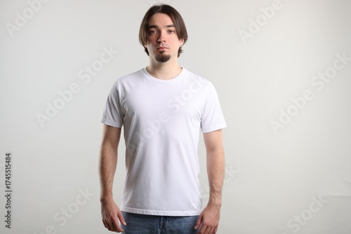 © New Africa, Fototapeta premium Young man wearing stylish white t-shirt near light grey background. Mockup for design