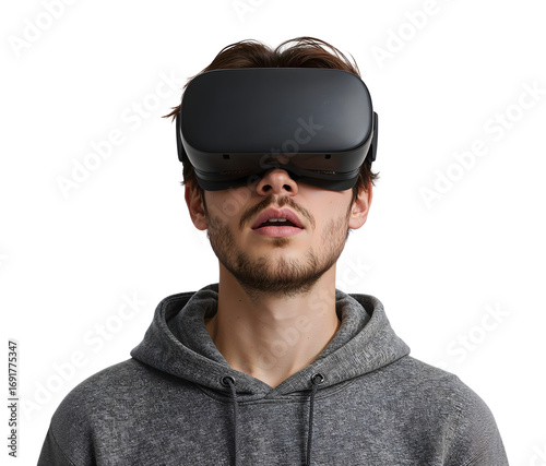 © Borasca, Fototapeta premium Young man wearing virtual reality headset experiencing immersive technology in casual hoodie on the transparent background