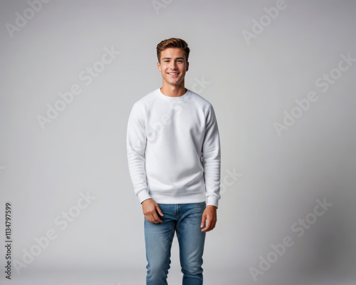 © QuoDesign, Fototapeta premium Young man wearing white sweatshirt and jeans isolated on grey background