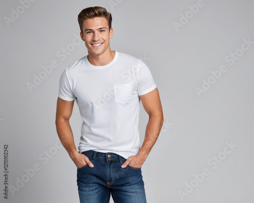 © QuoDesign, Fototapeta premium Young man wearing white t-shirt and jeans isolated on grey background