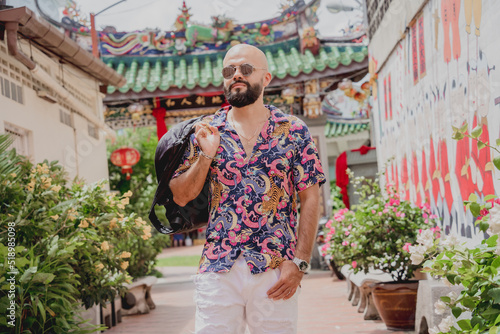 © romaset, Fototapeta premium Young man with a backpack on the background of an asian temple