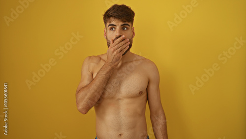 © Krakenimages.com, Fototapeta premium Young man with a beard looking surprised, covering his mouth, against an isolated yellow background