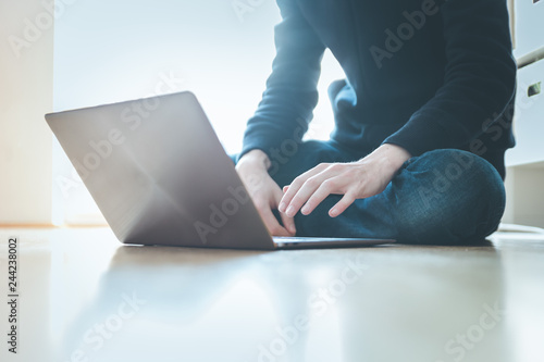 © Patrick Daxenbichler, Naklejka premium Young man with a modern laptop is sitting on the wooden floor