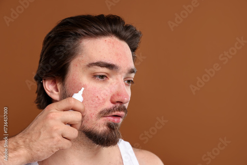 Obraz premium Young man with acne problem applying cream onto his face on brown background. Space for text