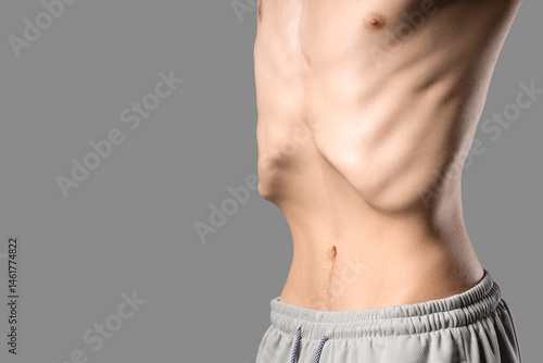 © Pixel-Shot, Naklejka premium Young man with anorexia on grey background, closeup