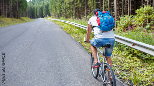 © skumer, Fototapeta premium Young man with backpack cycling on road in mountains. Bicycle tourism background with copy space