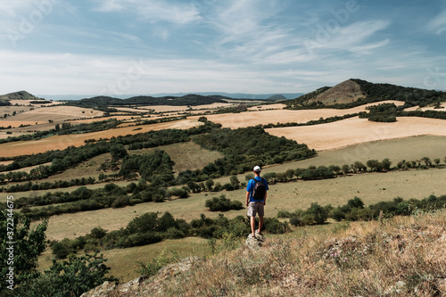 © Space Creator, Fototapeta premium Young man with backpack standing on rock and looking to Czech central mountain valley