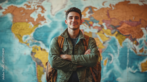© hocine, Fototapeta premium Young man with backpacks standing confidently in front of a colorful world map, representing travel, adventure, and exploration spirit in a modern setting