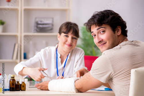 Fototapeta premium Young man with bandaged arm visiting female doctor traumatologis