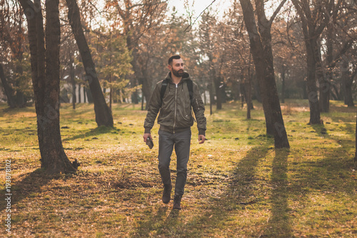 Fototapeta premium young man with beard in forest. Exploring the forest
