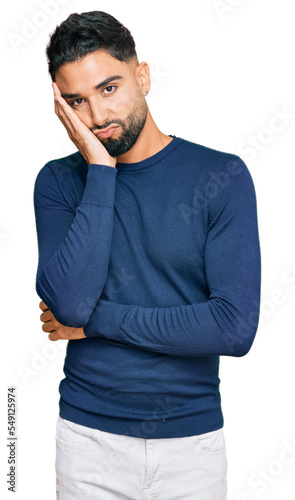 Fototapeta premium Young man with beard wearing casual blue winter sweater thinking looking tired and bored with depression problems with crossed arms.