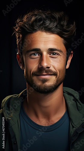 © tanyastock, Fototapeta premium Young man with beautiful smile on background. Teeth whitening. Smile emotion illustration. Generative AI