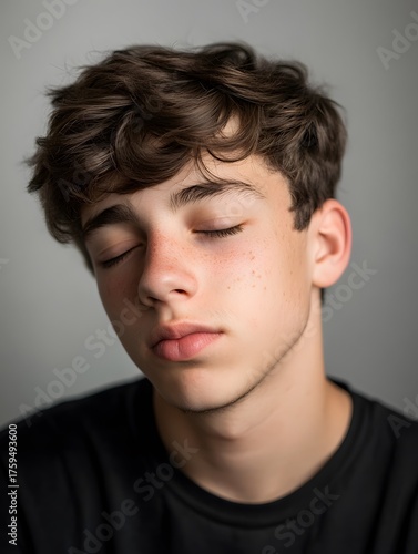 Fototapeta premium Young man with closed eyes, relaxed expression, capturing a moment of peace...