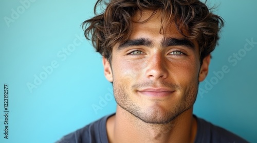 © by, Fototapeta premium Young man with curly hair smiling against a vibrant blue background, exuding confidence and warmth