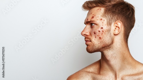 Fototapeta premium Young Man with Cystic Acne Facing Left Against Plain Background for Health and Wellness Use