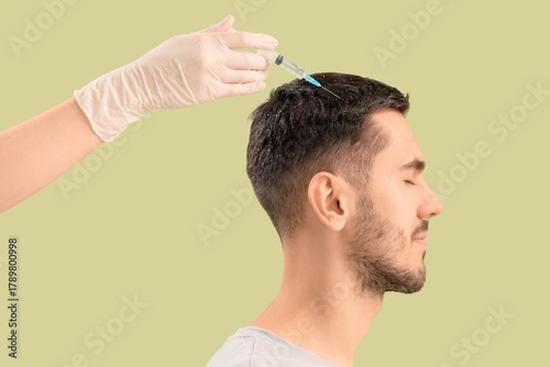 Fototapeta premium Young man with dandruff receiving injection for hair growth on color background