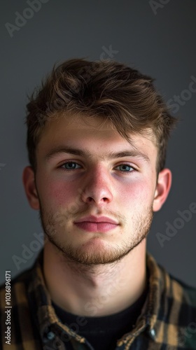Fototapeta premium Young man with expressive gaze and tousled hair poses against a dark background