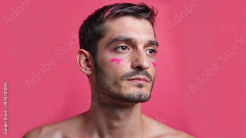 © umut hasanoglu, Fototapeta premium Young man with face paint gazes thoughtfully, against a bright pink background.
