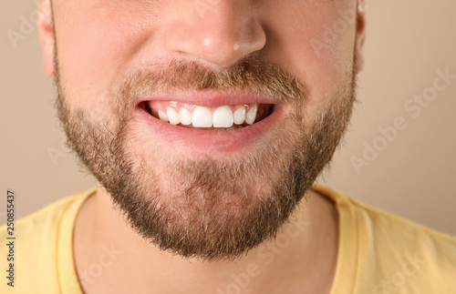 Obraz premium Young man with healthy teeth on color background, closeup