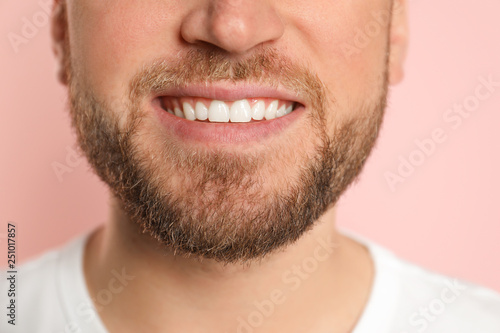 Obraz premium Young man with healthy teeth on color background, closeup