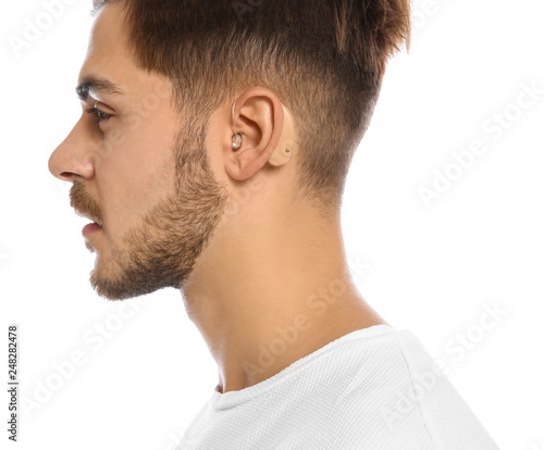 © New Africa, Fototapeta premium Young man with hearing aid on white background