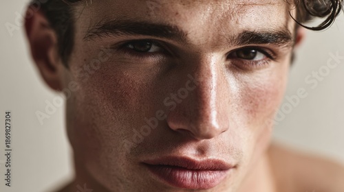 © InfiniteStudio, Fototapeta premium Young man with light skin and dark hair looks directly at the camera with a neutral expression in a simple setting