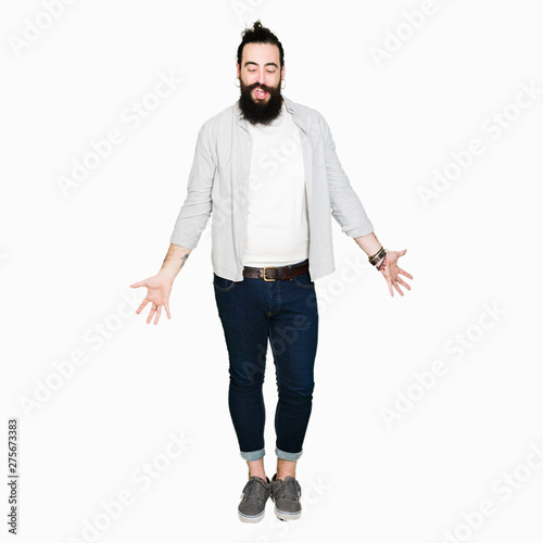 Naklejka premium Young man with long hair, beard and earrings making fish face with lips,...