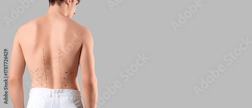 Obraz premium Young man with markings on his back against grey background. Plastic surgery...