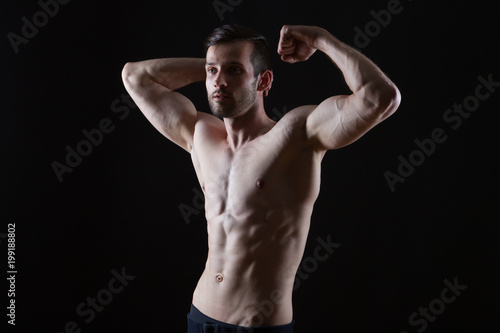 © DaraGor, Fototapeta premium young man with muscle hands up on black background
