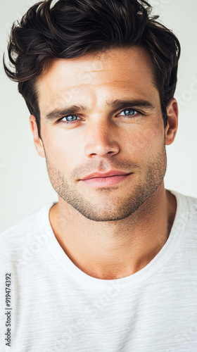 Fototapeta premium Young man with piercing blue eyes and dark hair.