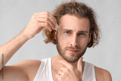 Obraz premium Young man with serum for skin care on grey background