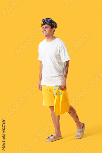 Fototapeta premium Young man with snorkeling mask and flippers on yellow background