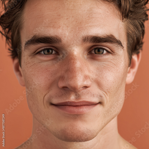 © Irina, Obraz premium Young man with tousled hair smiling against orange background
