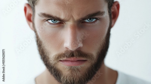 Obraz premium Young man with trimmed beard, deep-set eyes, and serious look, showing focus, isolated on white