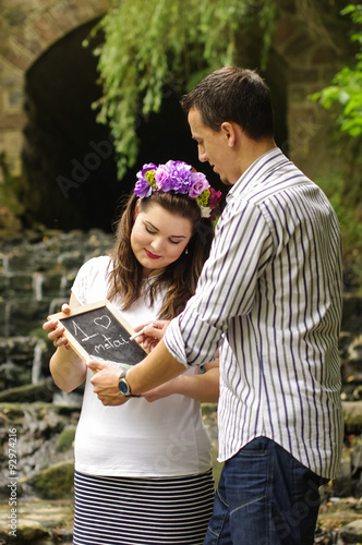 Fototapeta premium Young man writting text "1 year" on the blackboard in the nature
