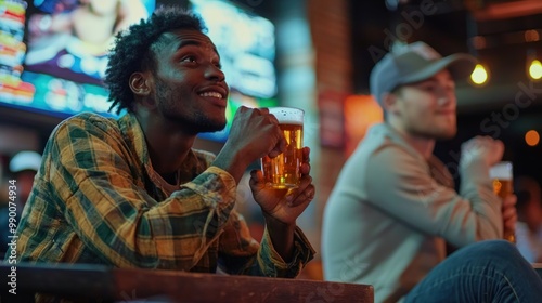 Obraz premium Young men drinking beer at a lively sports bar, watching a game.