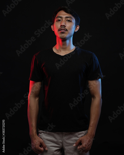© AndhikaRaya, Naklejka premium Young men in empty black T-shirts, stylish and posing like famous T-shirt models. Men's t-shirt template and mockup design for print.