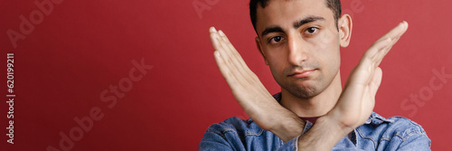 © Drobot Dean, Obraz premium Young middle eastern man showing stop gesture at camera