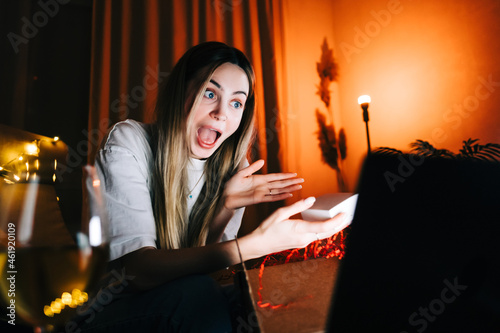 Naklejka premium Young millennial woman open gift in front laptop computer during video call and drinking wine, use technology for communicate with friends or family.