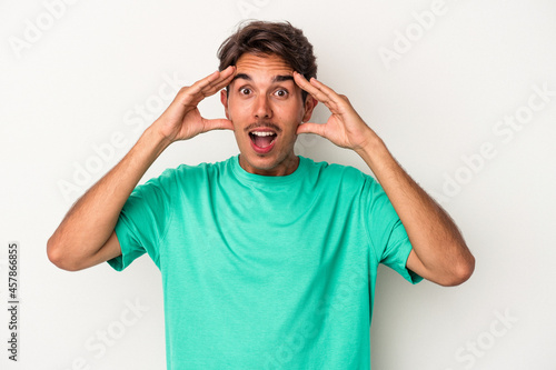© Asier, Naklejka premium Young mixed race man isolated on white background receiving a pleasant surprise, excited and raising hands.