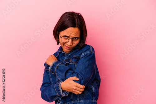 Obraz premium Young mixed race woman isolated on pink background confused, feels doubtful...