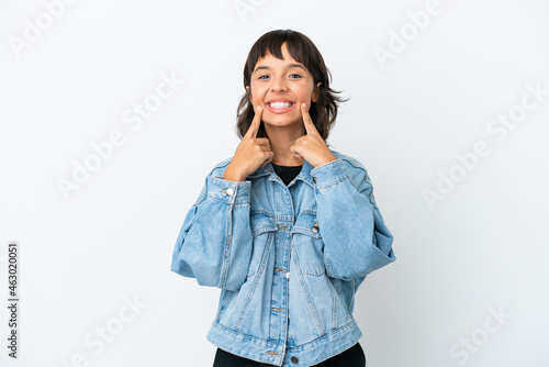 Fototapeta premium Young mixed race woman isolated on white background smiling with a happy and pleasant expression