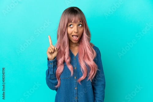 © luismolinero, Fototapeta premium Young mixed race woman with pink hair isolated on blue background intending to realizes the solution while lifting a finger up