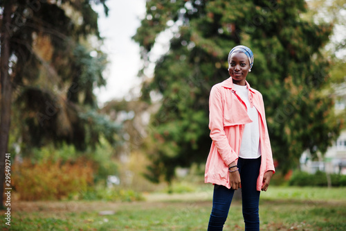 Obraz premium Young modern fashionable, attractive, tall and slim african muslim woman in hijab or turban head scarf and pink coat posed at park.
