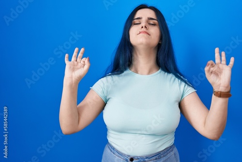 Fototapeta premium Young modern girl with blue hair standing over blue background relaxed and smiling with eyes closed doing meditation gesture with fingers. yoga concept.