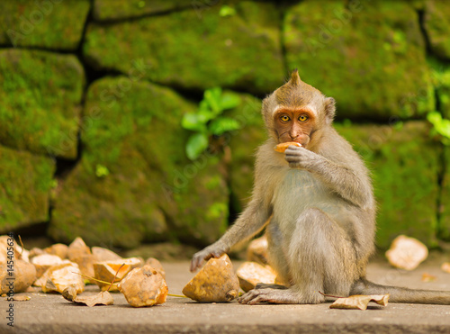 Fototapeta premium Young monkey eating sweet potatoes. Monkey Forest, Ubud, Bali, Indonesia
